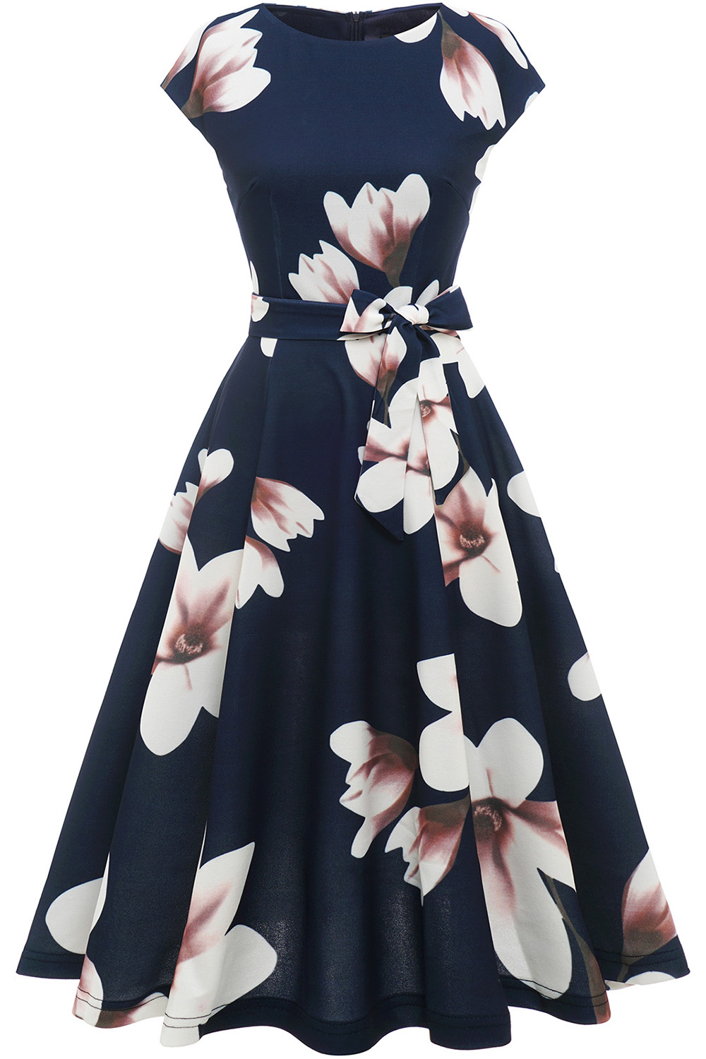 Navy Blue Flower 2025 Women's Floral Cocktail, Tea Length Wedding Guest Dresses - Vintage, Graduation, Prom & Bridesmaid with Cap Sleeves
